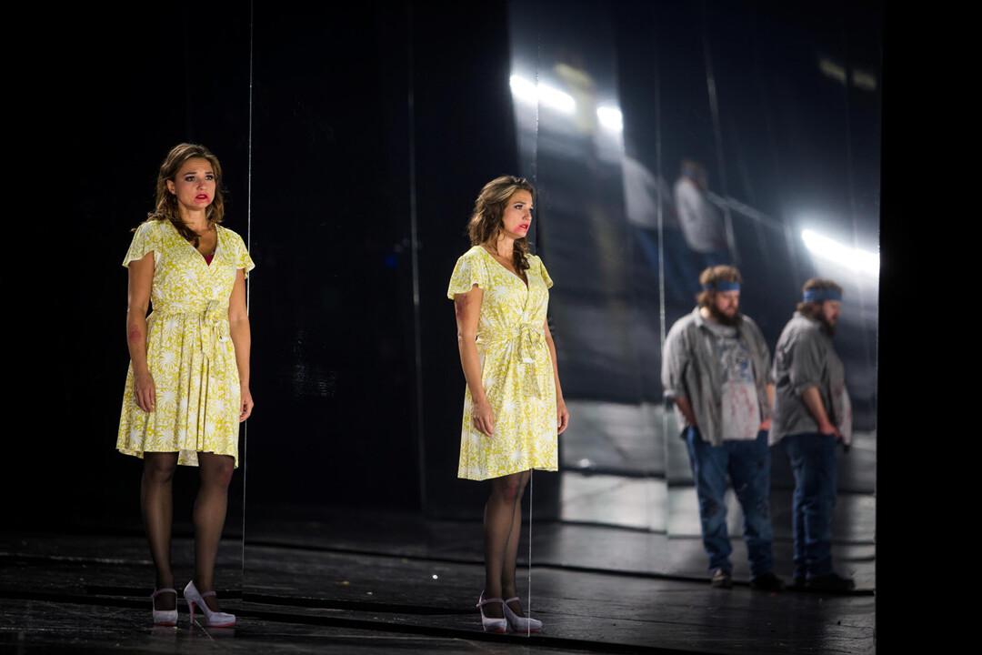 On the run from the police, the widow Leokadja Begbick founds the city of Mahagonny together with Trinity Moses and Fatty the »Bookkeeper«. With cheap booze, women and the promise of an idyllic life, this »new paradise« is supposed to attract workers from the Gold Coast, bringing a steady flow of cash into the coffers of the trio. To begin with, the idea is a hit, and Mahagonny grows rapidly. Jim Mahoney, Jack O’Brien, Joe and Bill, four lumberjacks from Alaska, are among the new arrivals. As soon as they arrive, Begbick sends the men to the brothel, where Jim picks out Jenny.