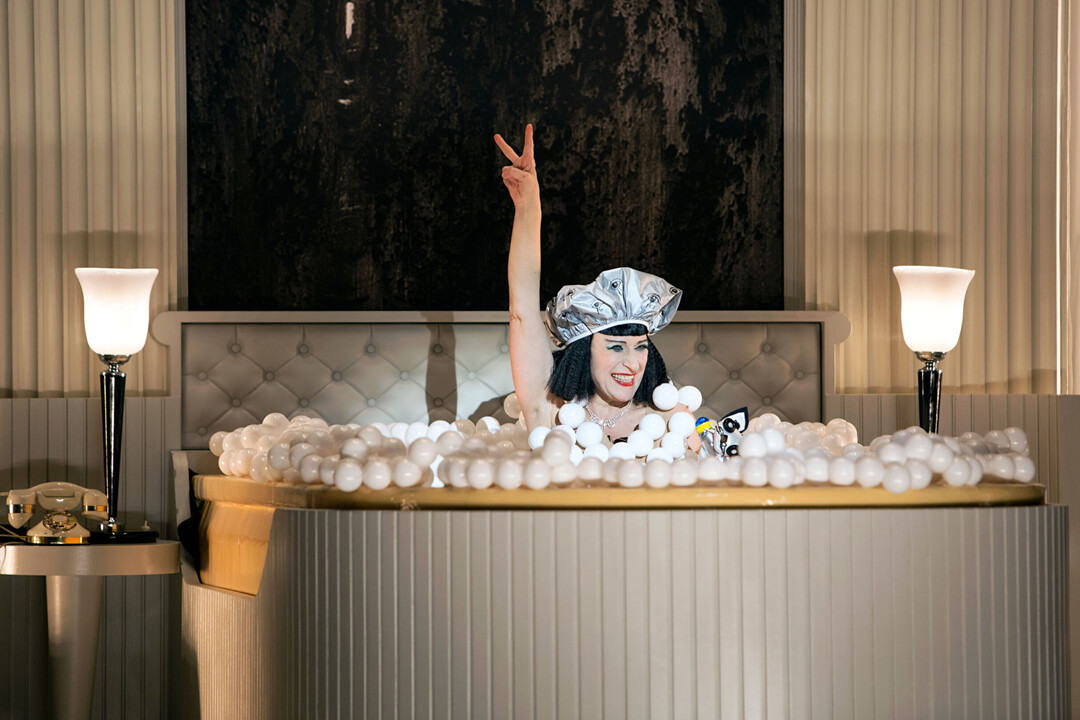 Dagmar Manzel as Cleopatra in a bathtub with plastic balls