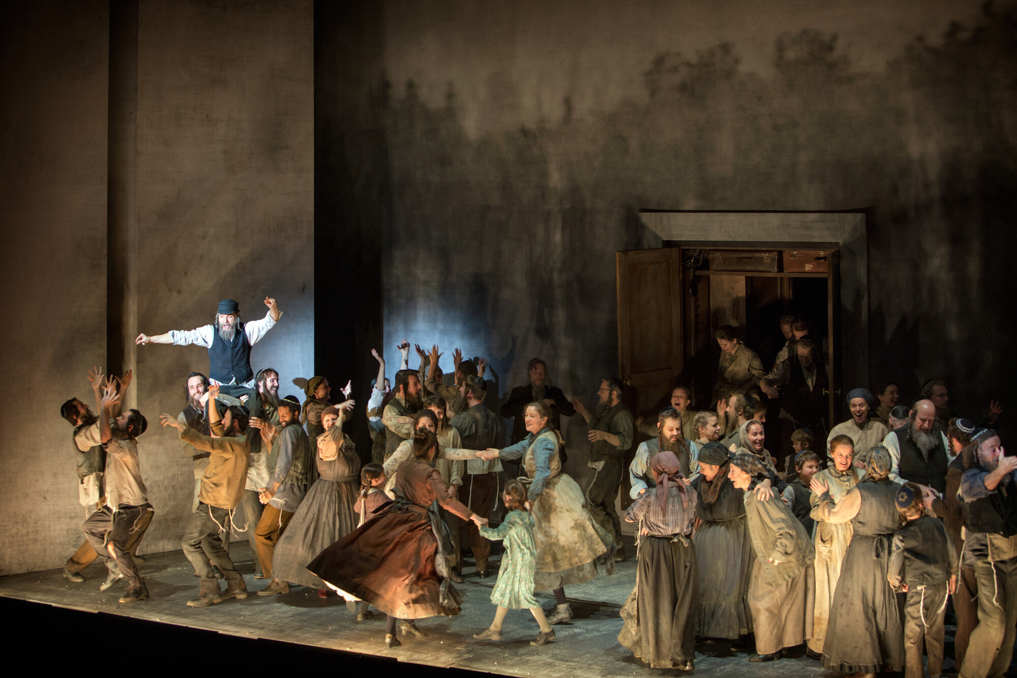 Koen Schoots Ja, erstaunlich wie das Gespräch zwischen Lazar Wolf und Tevje über die Heiratsfrage zu »L’Chaim« führt. Das artet regelrecht aus, in einen kollektiven Tanz unter Beteiligung aller anderen Männer. Auch die Hochzeitstänze nehmen großen Raum ein. Das ist aber ganz bewusst so gesetzt: Im ersten Teil des Stücks wird diese Lebensfreude etabliert, um dann im zweiten Teil umso wirkungsvoller den Zusammenbruch zu zeigen. Da gibt es dann keine Tanznummern mehr, sondern es wird ein Kammerspiel daraus, das sehr melodramatisch endet. Die Tänze sind Ausdruck des Lebensgefühls und der Lebensfreude der Bewohner von Anatevka. Das bekommt eine Allgemeingültigkeit, weit über ein jüdisches Schtetl hinaus. Es geht um Geborgenheit. Und diese Welt wird durch Einflüsse von außen kaputt gemacht. Ob dieser Ort nun Anatevka heißt oder Aleppo, ob das vor hundert Jahren in Russland, oder vor 20 Jahren in Bosnien passiert, ist nicht so wichtig. Ich glaube, da liegt die eigentliche Aussage des Stückes.