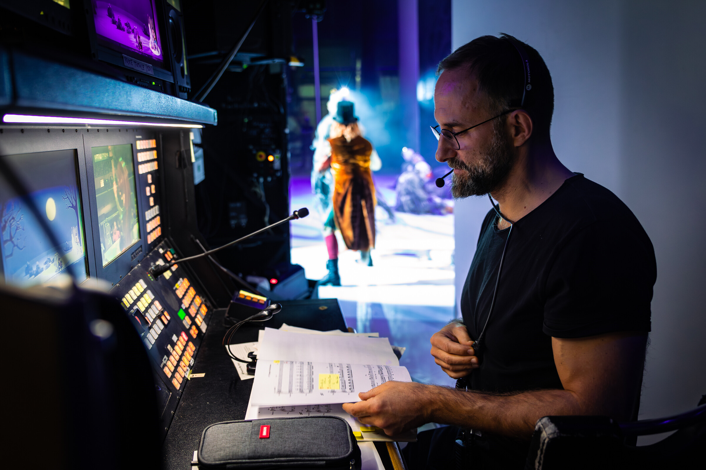 Axel Baer: Das Buch basiert auf dem Klavierauszug des Stückes, so dass ich die Vorstellung Takt für Takt verfolgen kann. Darin sammle ich während der Proben alle wichtigen Auf- und Abgänge, Umbauten, alle Kommandos, die ich zur richtigen Zeit ausrufen muss, damit Techniker:innen und Darsteller:innen zur richtigen Zeit am richtigen Ort sind. Ganz wichtig sind auch die Ablaufzeiten für jede Szene. Am Ende ist es ein dickes Buch mit vielen Klebezetteln an den wichtigen Stellen, dass sich wie ein Puzzle aus den Proben ergeben hat und mir hilft, die Vorstellung taktgenau zu ‚fahren‘.