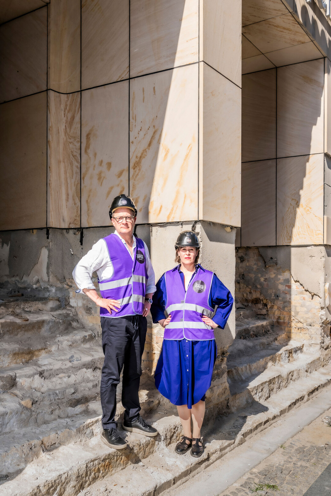 Auf der Treppe am Haupteingang des Haupthauses in der Behrenstraße: Philip Bröking und Susanne Moser, Co-Intendanz der Komischen Oper Berlin