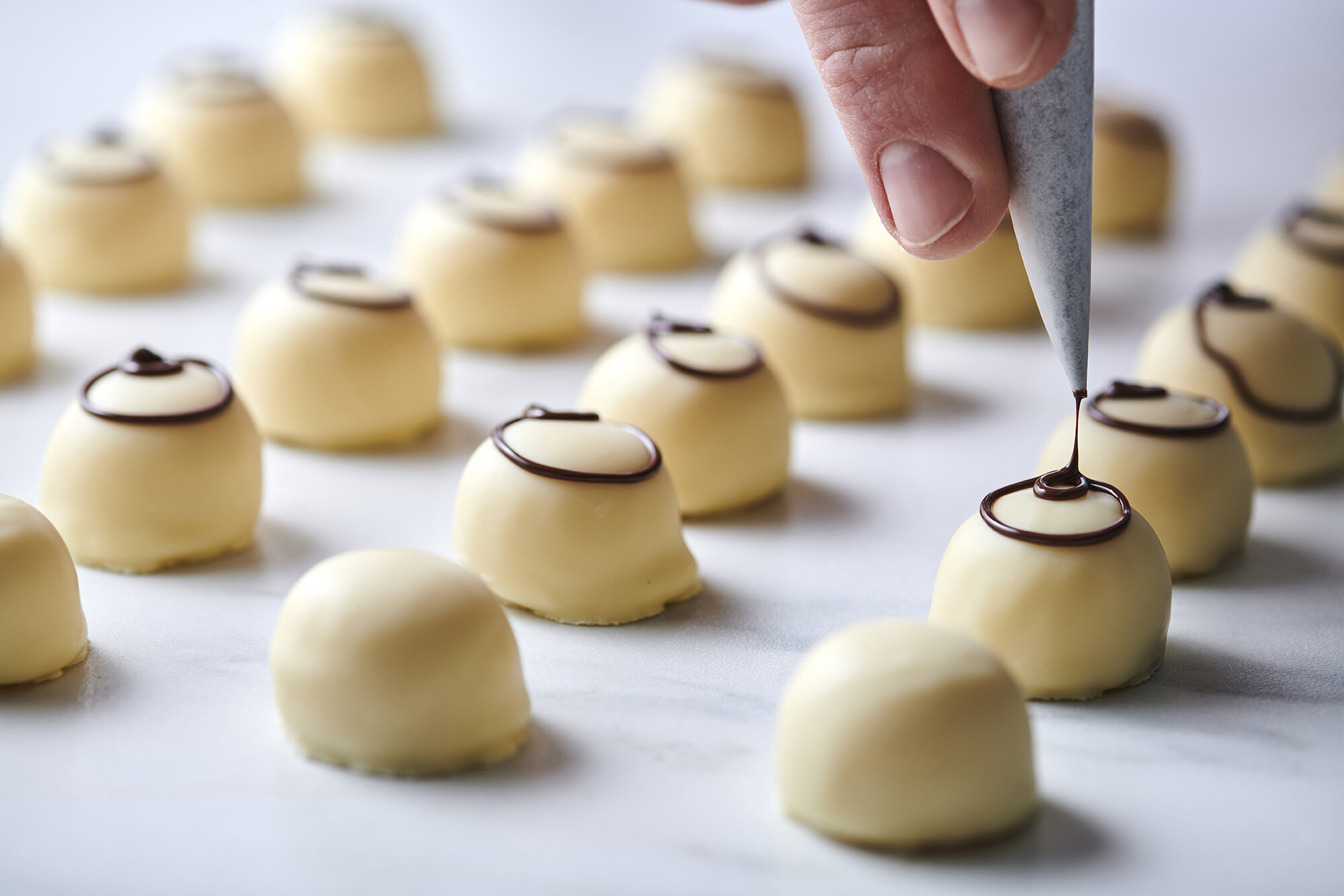 Melanie Hübel: Nach der experimentellen, spielerischen Phase, in der wir zwei oder drei Rezepturen entwickelt haben, folgt ein sehr ernsthafter Prozess. Denn eine Rezeptur für eine Praline muss sich auch in der seriellen Herstellung beweisen. Bevor wir ein neues Produkt an unsere Kund:innen verkaufen, muss es zudem Lager- und Labortests bestehen. Erst dann findet eine neue Praline ihren Weg in den Verkauf.