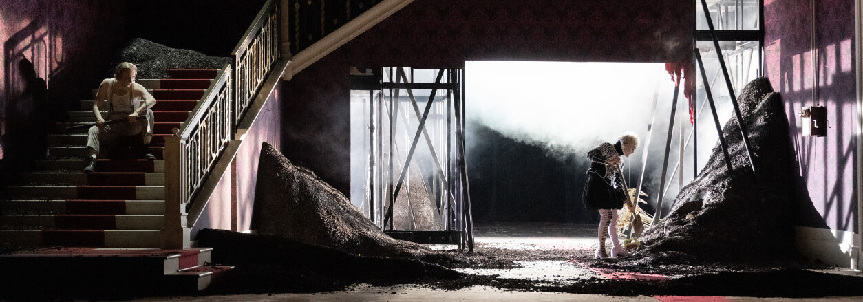 Dass das Groteske in Verbindung mit dem Tragischen eine essentielle Zutat von Shakespeares Dramen ist, stellte bereits Ambroise Thomas’ Zeitgenosse Victor Hugo 1827 fest. Diese grotesk-komischen Elemente in Hamlet hebt Nadja Loschky hervor und lässt somit die erhabene Fassade des dänischen Hofes bröckeln, was sich nicht zuletzt auch in Etienne Pluss’ Bühnenbild widerspiegelt.
