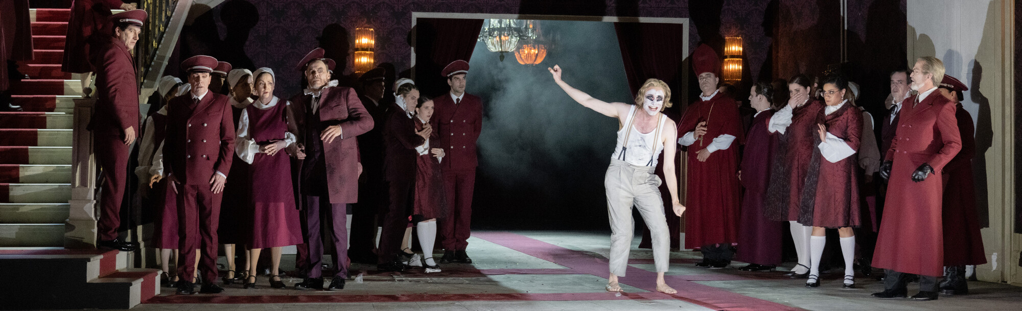 Frei von allen Operntraditionen komponiert Thomas im dritten Akt eine Dialogszene zwischen Gertrude und Hamlet, in der Hamlet seiner Mutter klar und deutlich seinen Hass auf sie als Mörderin seines Vaters entgegenschleudert. Mit insgesamt zwölf aufgewühlten Tempowechseln nimmt diese Szene Fahrt auf und zeigt einen klarsichtigen Hamlet, der von seiner Mutter als verrückt dargestellt wird. Dieser Eindruck Königin Gertrudes entsteht einerseits durch ihre Angst, entdeckt zu werden, andererseits durch Hamlets das Regelwerk sprengende Verhalten wie im zweiten Akt. Ganz im Stil des Drame lyrique stimmt Hamlet dort nämlich eine beschwingte und festliche »Chanson bachique«, also ein Trinklied an. Ambroise Thomas setzt das Trinklied aber gekonnt musikdramaturgisch ein, was diesen scheinbaren Feieranlass in eine düstere Szene kippen lässt. Als Hamlet mit Hilfe eines ausgeklügelten Schauspiels König Claudius als Mörder seines Vaters enttarnen will, setzt er an: »Wein, zerstreue die Sorgen.« (»Ô vin, dissipe la tristesse«). Nachdem die Mausefalle zugeschnappt ist und er Claudius laut als Verbrecher beschuldigt, bricht Tumult am Hof aus. Doch Thomas lässt Hamlet den sich empörenden Chor mit einer Reprise des Trinklieds unterbrechen. Ein bizarrer Einfall, wenn man die Tragweite der öffentlichen Anklage und der persönlichen Tragödie bedenkt. Während Gertrude und der Hof ihm Wahnsinn attestieren, nutzt Regisseurin Nadja Loschky diese Gelegenheit, um zu beweisen, dass Hamlet der einzige Hellsichtige ist, der Einzige, der aus dem vorgesehenen Weg ausschert und dadurch anders als alle anderen ist. Inspiriert von Shakespeares Satz »Etwas ist faul im Staate Dänemark« zeigt sie: Er ist der Einzige, der den Verfall hinter der höfischen Fassade sieht. Auch Etienne Pluss’ Bühnenbild, in dem ein repräsentativer Palastsaal mit herrschaftlicher Treppe nach und nach zerfällt, zeigt bildlich Hamlets Perspektive auf diese verrottete Welt.