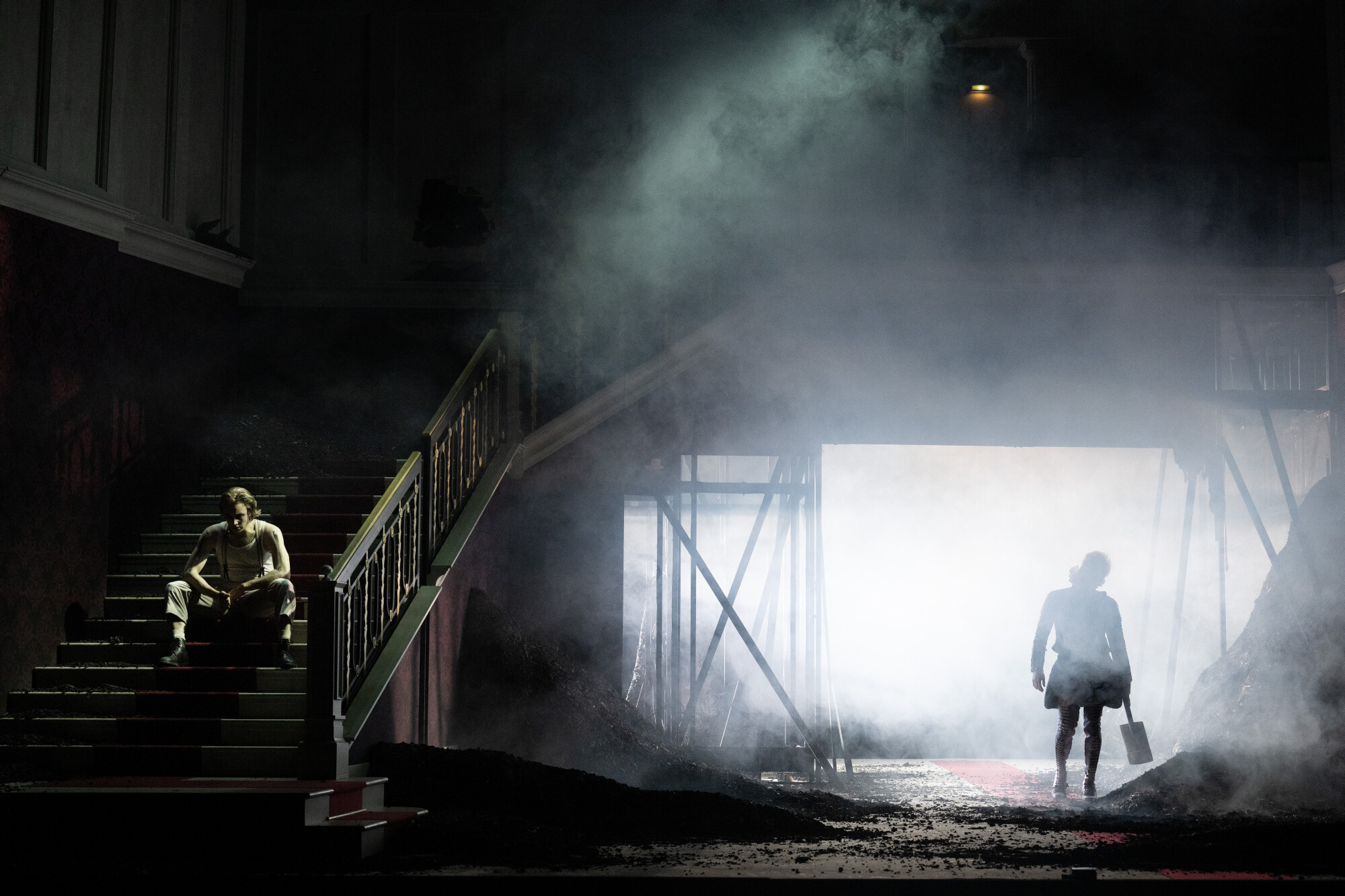 Frei von allen Operntraditionen komponiert Thomas im dritten Akt eine Dialogszene zwischen Gertrude und Hamlet, in der Hamlet seiner Mutter klar und deutlich seinen Hass auf sie als Mörderin seines Vaters entgegenschleudert. Mit insgesamt zwölf aufgewühlten Tempowechseln nimmt diese Szene Fahrt auf und zeigt einen klarsichtigen Hamlet, der von seiner Mutter als verrückt dargestellt wird. Dieser Eindruck Königin Gertrudes entsteht einerseits durch ihre Angst, entdeckt zu werden, andererseits durch Hamlets das Regelwerk sprengende Verhalten wie im zweiten Akt. Ganz im Stil des Drame lyrique stimmt Hamlet dort nämlich eine beschwingte und festliche »Chanson bachique«, also ein Trinklied an. Ambroise Thomas setzt das Trinklied aber gekonnt musikdramaturgisch ein, was diesen scheinbaren Feieranlass in eine düstere Szene kippen lässt. Als Hamlet mit Hilfe eines ausgeklügelten Schauspiels König Claudius als Mörder seines Vaters enttarnen will, setzt er an: »Wein, zerstreue die Sorgen.« (»Ô vin, dissipe la tristesse«). Nachdem die Mausefalle zugeschnappt ist und er Claudius laut als Verbrecher beschuldigt, bricht Tumult am Hof aus. Doch Thomas lässt Hamlet den sich empörenden Chor mit einer Reprise des Trinklieds unterbrechen. Ein bizarrer Einfall, wenn man die Tragweite der öffentlichen Anklage und der persönlichen Tragödie bedenkt. Während Gertrude und der Hof ihm Wahnsinn attestieren, nutzt Regisseurin Nadja Loschky diese Gelegenheit, um zu beweisen, dass Hamlet der einzige Hellsichtige ist, der Einzige, der aus dem vorgesehenen Weg ausschert und dadurch anders als alle anderen ist. Inspiriert von Shakespeares Satz »Etwas ist faul im Staate Dänemark« zeigt sie: Er ist der Einzige, der den Verfall hinter der höfischen Fassade sieht. Auch Etienne Pluss’ Bühnenbild, in dem ein repräsentativer Palastsaal mit herrschaftlicher Treppe nach und nach zerfällt, zeigt bildlich Hamlets Perspektive auf diese verrottete Welt.