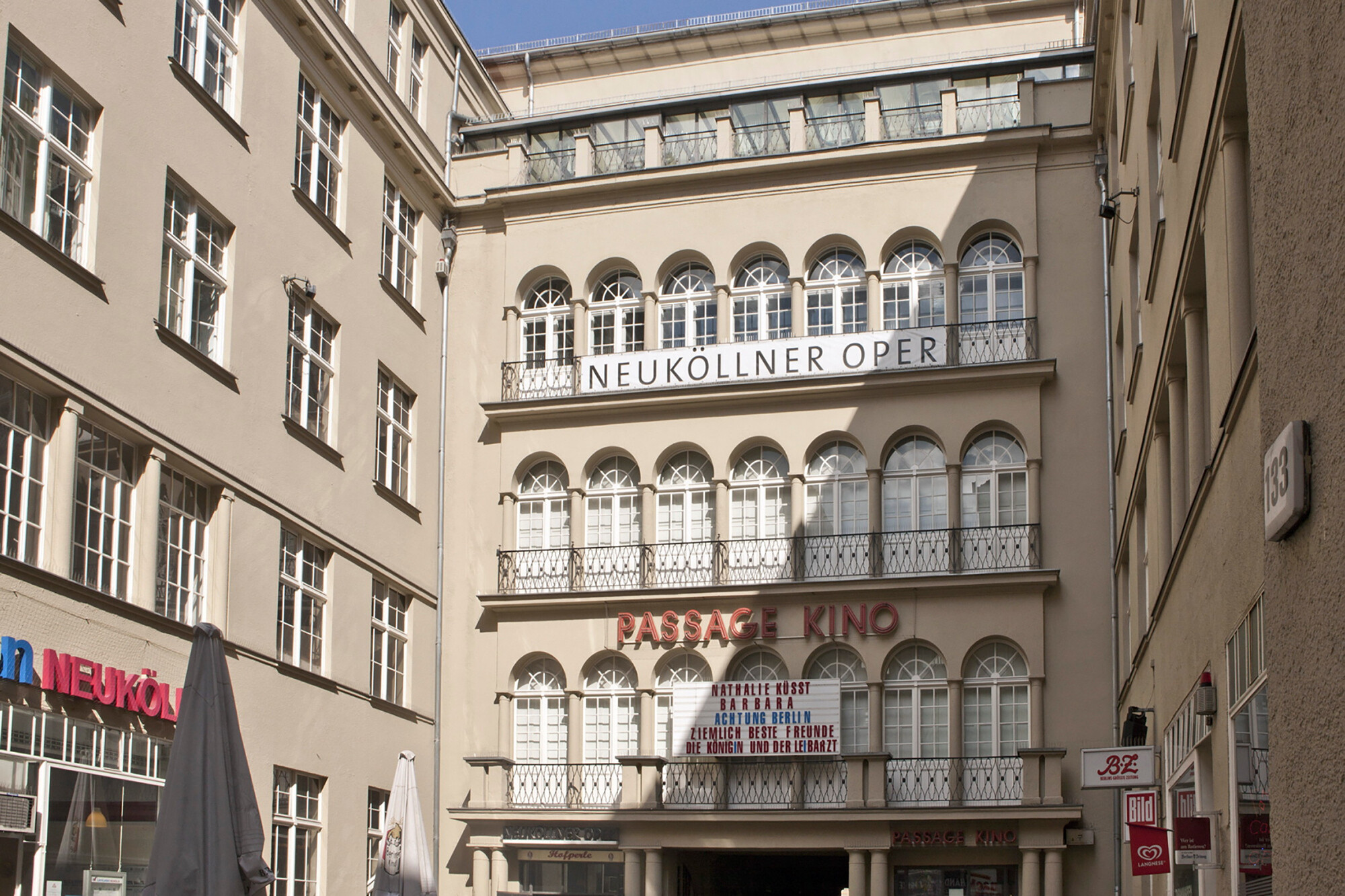 Die Passage Neukölln, 1908 –1910 unter Stadtbaurat Reinhold Kiehl erbaut, ist der erste offene Passagenbau Berlins mit einem bis heute unveränderten Mix aus Kultur, Kommerz und Wohnen. Das Gebäudeensemble zählt zu den herausragenden Baudenkmälern Neuköllns und ist kultureller Leuchtturm der sich wandelnden Karl-Marx-Straße. Direkt unter dem Dach sitzt seit 1988 die Neuköllner Oper – Berlins Produktionshaus für freies Musiktheater – und bespielt den ehemaligen Ballsaal des Vergnügungskomplexes. In zeitgenössischen, vornehmlich Ur- und Erstaufführungen, greift die Neuköllner Oper die Diskurse dieses vitalsten aller Berliner Stadtteile auf und bringt sie mit einer guten Portion Pop auf die Bühne.
