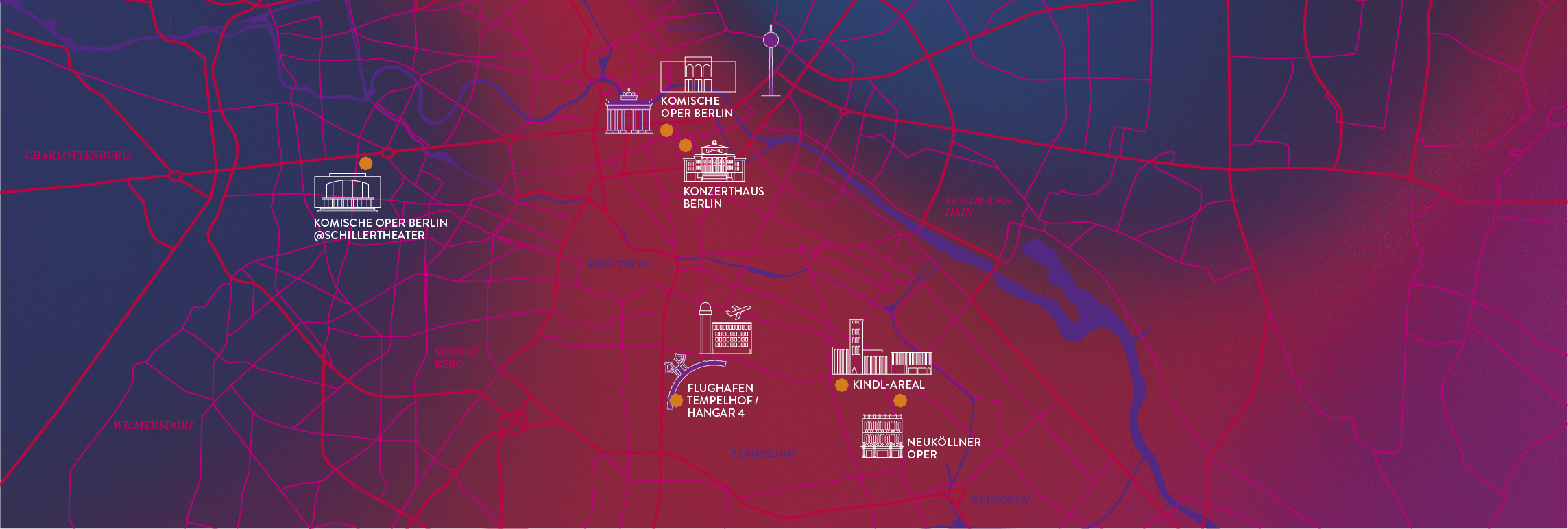 Wir bauen für Sie um! Seit September 2023 wird der Gebäudekomplex der Komischen Oper Berlin an der Behrenstraße umfassend saniert, modernisiert und erweitert. Wir spielen weiter ... und wie! In der Zeit des Umbaus wird nicht nur im Schillertheater gespielt, sondern auch im Flughafen Tempelhof, dem Kindl-Areal, der Neuköllner Oper, dem Konzerthaus Berlin und in den vielen Kiezen der Stadt.